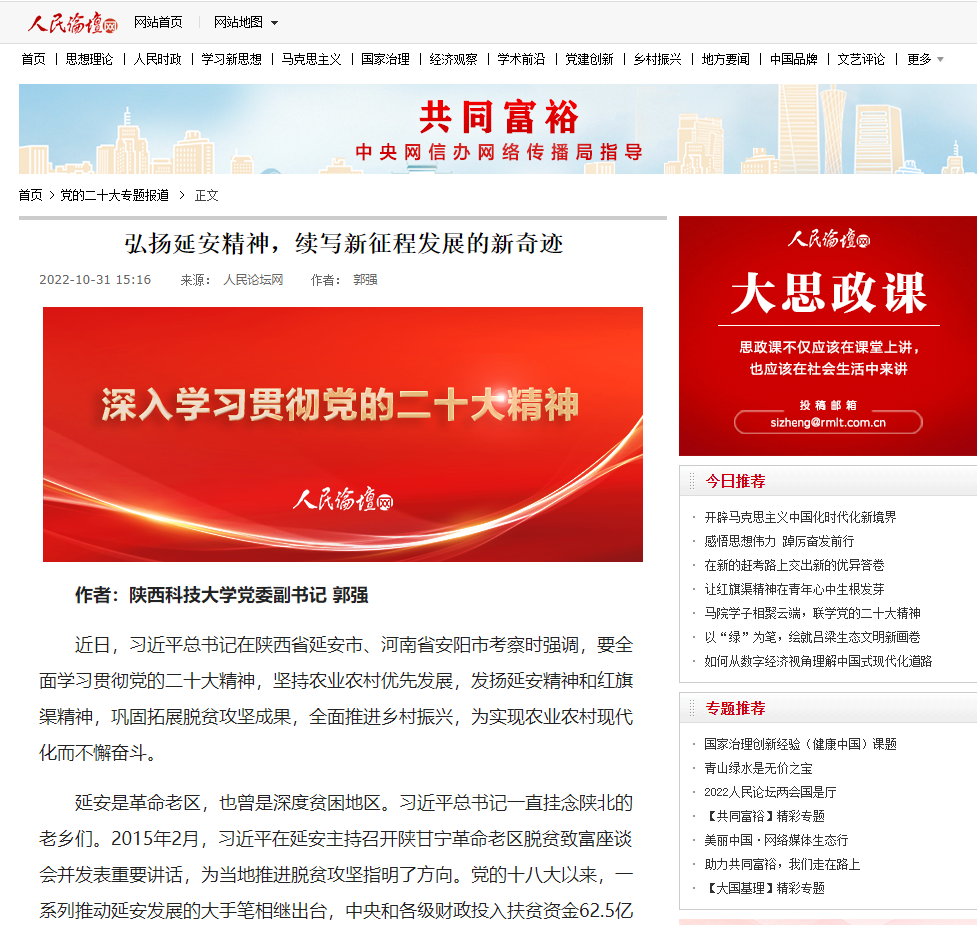 近日,人民论坛网“党的二十大专题报道”刊发德赢官网党委副书记郭强的理论文章《弘扬延安精神,续写新征程发展的新奇迹》。