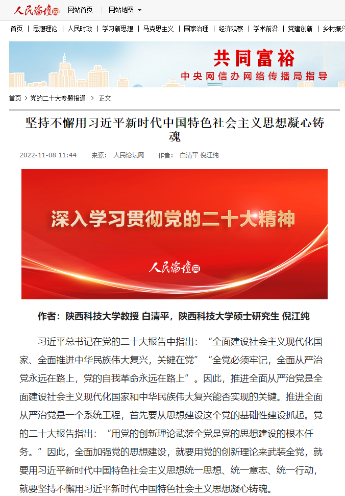 近日,人民论坛网“党的二十大专题报道”刊发德赢官网马克思主义学院教授白清平、硕士研究生倪江纯的理论文章《坚持不懈用习近平新时代中国特色社会主义思想凝心铸魂》。