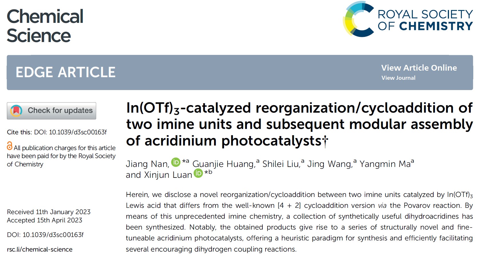 该项工作以“In(OTf)3-catalyzed reorganization/cycloaddition of two imine units and subsequent modular assembly of acridinium photocatalysts”为题发表在国际顶级化学期刊Chemical Science。