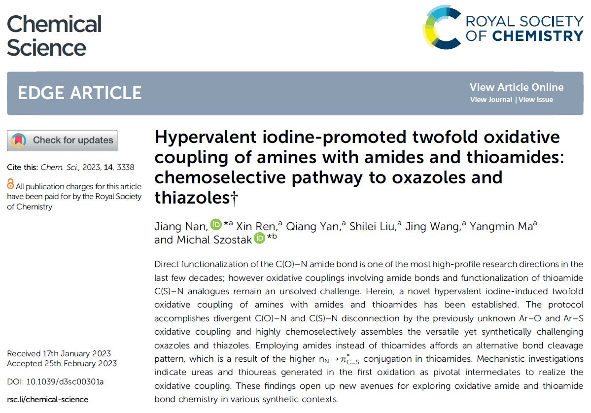 该项工作以“Hypervalent iodine-promoted twofold oxidative coupling of amines with amides and thioamides: Chemoselective entryway to oxazoles and thiazoles”为题发表在国际顶级化学期刊Chemical Science。