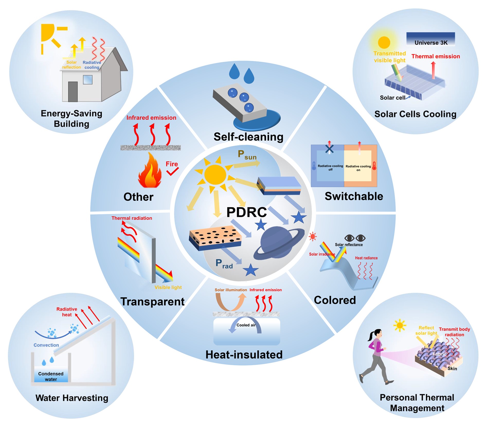 随着全球变暖加剧和极端高温天气频发,人体、建筑、设备等的降温需求日益迫切。传统制冷系统虽然能够实现降温,但其运行所需的制冷剂和电力严重加剧了温室效应和能源消耗,对绿色可持续发展构成巨大威胁。是否存在一种新型的绿色降温方式,可以在不消耗能源的情况下实现降温?辐射降温技术是一种无需能量输入的物理降温技术,它通过对太阳光和中红外波段光谱进行选择性精准调控,最终实现物体的无源持续降温。该技术有助于缓解能源危机和温室效应,对实现“双碳”目标具有重要意义。