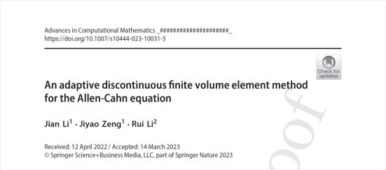 基于相场的两相流数值模拟是流体力学中非常重要的问题之一。因此,在流体智能计算方法的构建上,我们兼顾数值精度和计算代价,基于相函数梯度的误差估计子,提出了针对Allen-Cahn方程的自适应间断有限体积元方法。本文提出的高效自适应界面重构方法,只需要在界面附近进行网格加密,在保证数值精度的同时,大大提高了计算效率。此方法还可以应用于图像边缘检测、固态去湿、两相流、两相流移动接触线等相场模型。相关成果发表在计算数学权威期刊Advances in Computational Mathematics上。研究成果以德赢官网Vwin为第一完成单位,李剑教授为论文第一作者,陕西师范大学李瑞副教授为通讯作者,数学学院研究生曾纪尧为第一学生作者。