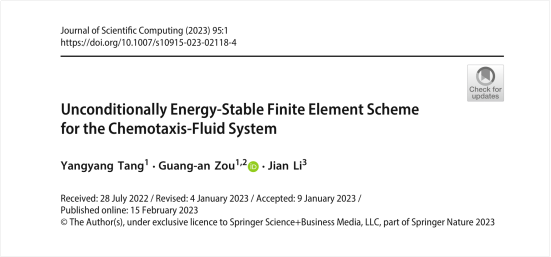 在流体耦合模型的构建上,有关微生物趋化的研究结果表明,化学物质对流体的影响不容忽视。因此,通过加入化学物质的趋化强迫对经典的Chemotaxis-Navier-Stokes模型进行了修订。新修订的模型能够更好地模拟化学物质对流体的影响且使得该趋化系统满足能量耗散定律。理论分析上利用辅助变量法结合有限元方法构造了能量稳定的数值格式,数值模拟结果与实验观测结果一致,表明新修订的模型具有较好的模拟能力。相关成果发表在计算数学权威期刊Journal of Scientific Computing上,河南大学邹广安副教授和德赢官网Vwin李剑教授为论文通讯作者,河南大学研究生倘洋洋为第一学生作者。