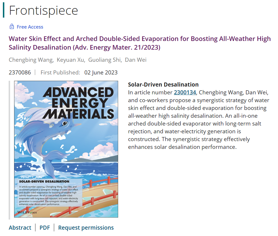 近日,德赢官网材料科学与工程学院(文物保护科学与技术学院)光热转换材料的功能化调控及应用创新团队在光热界面水蒸发领域取得重要进展,相关研究成果以“Water Skin Effect and Arched Double-Sided Evaporation forBoosting All-Weather High Salinity Desalination”为题,发表于Wiley杂志社旗下的国际顶级期刊Advanced Energy Materials(影响因子29.698),并被邀请作为当期Frontispiece(扉页论文)进行高亮推荐。王成兵教授、硕士研究生卫丹为论文通讯作者,参与该工作的还有硕士研究生许珂圆和石国良。德赢官网Vwin为论文唯一署名单位,该论文的发表提高了德赢官网在光热界面蒸发材料领域的国际影响力。
