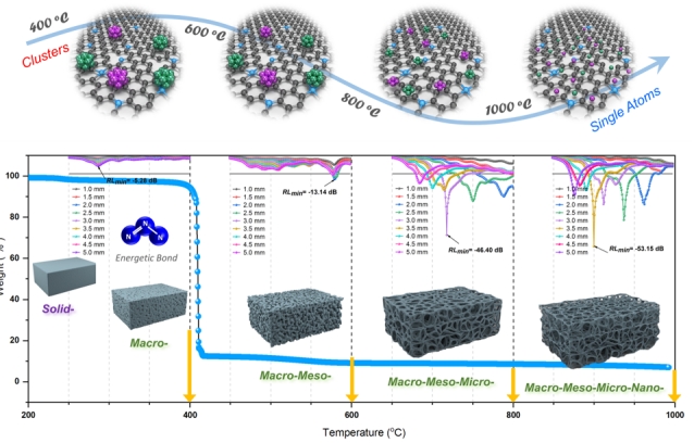 黄文欢课题组与复旦大学车仁超教授合作设计低CoFe含量的含能MOF(金属三氮唑)前驱体,通过三氮唑400度左右的“爆炸”反应可以成功合成具有超低金属负载、超低密度的具有多级孔结构的CoFe掺杂三维碳海绵材料。实现对金属原子级分散、材料介电性能、耦合性能、阻抗匹配等的可控调控。