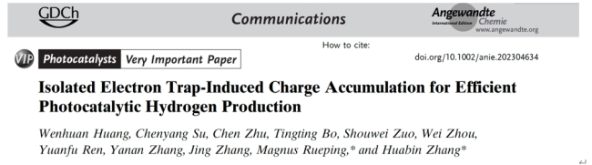 W. Huang, C. Su, C. Zhu, T. Bo, S. Zuo, W. Zhou, Y. Ren, Y. Zhang, J. Zhang, M. Rueping*, H. Zhang*,Isolated Electron Trap-Induced Charge Accumulation for Efficient Photocatalytic Hydrogen Production,Angew Chem., Int. Ed.,2023, e202304634.(VIP paper)(2022影响因子:16.6)