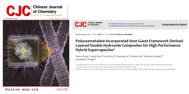 Y. Zhang, J. Chen, F. Razq, C. Su, X. Hou,W. Huang*,and H. Zhang*, Polyoxometalate-incorporated host-guest framework derived layered double hydroxide composites for high-performance hybrid supercapacitor,Chinese Journal of Chemistry,2023,41, 75-82.(杂志封面Outside Front Cover)(2022影响因子:5.4)