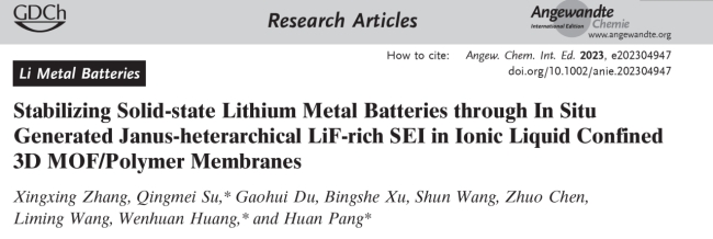 X. Zhang, Q. Su*, G. Du, B. Xu, S. Wang, Z. Chen, L. Wang,W. Huang*, H. Pang*, Stabilizing Solid-state Lithium Metal Batteries through In Situ Generated Janus-heterarchical LiF-rich SEI in Ionic Liquid Confined 3D MOF/Polymer Membranes,Angew Chem. Int. Ed.,2023, e202304947.(2022影响因子:16.6)