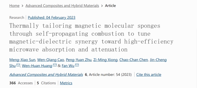 M. Sun, W. Cao, P. Zhu, Z. Xiong, C. Chen, J. Shu*,W. Huang*, Fan Wu*, Thermally tailoring magnetic molecular sponges through self-propagating combustion to tune magnetic-dielectric synergy towards high-efficiency microwave absorption and Attenuation,Advanced Composites and Hybrid Materials,2023, 6: 54.(2022影响因子:20.1)