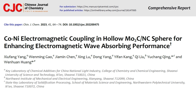 X. Yang, W. Gao, J. Chen, X. Lu, D. Yang, Y. Kang, Q. Liu, Y. Qing, andW. Huang*, Co-Ni Electromagnetic Coupling in Hollow Mo2C/NC Sphere for Enhancing Electromagnetic Wave Absorbing Performance,Chinese Journal of Chemistry,2023, 41, 64-74.(邀稿,2022影响因子:5.4)
