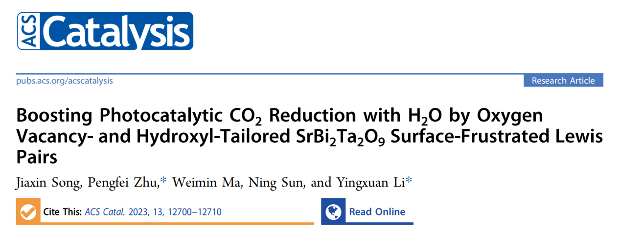 近日,德赢官网环境科学与工程学院朱鹏飞副教授联合哈尔滨工业大学李英宣教授在国际催化领域顶级期刊《ACSCatalysis》(IF=12.9,中科院一区)上发表题为“Boosting Photocatalytic CO2Reduction with H2O by Oxygen Vacancies and Hydroxyls Tailored SrBi2Ta2O9Surface Frustrated Lewis Pairs”的研究论文。该研究通过在SrBi2Ta2O9(SBT)表面成功构筑受阻Lewis酸碱对(FLPs),利用氧空位(VO)和表面羟基(-OH)分别作为Lewis酸位点和Lewis碱位点,有效地提高了SBT对CO2的吸附和活化能力,合成的VO-SBT-OH催化剂在没有任何牺牲剂和助催化剂的情况下用纯水将CO2高效还原为CO,达到了反应60小时的稳定性。德赢官网为论文的第一通讯单位,硕士生宋佳欣为第一作者,朱鹏飞副教授和李英宣教授为通讯作者。