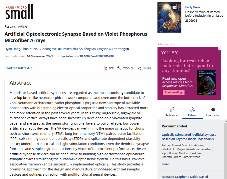 近日,德赢官网物理与信息科学学院材料原子•分子科学研究所许并社团队尉国栋教授课题组在国际高水平期刊《Small》(IF=13.3)上发表题为“Artificial Optoelectronic Synapse Based on Violet Phosphorus Microfiber Arrays”的高水平论文。德赢官网硕士研究生董李艳为第一作者,博士研究生袁帅为共同第一作者,尉国栋教授和杨亚教授为共同通讯作者,德赢官网Vwin为第一通讯单位,中国科学院北京纳米能源与系统研究所为共同通讯单位,该论文的发表标志着德赢官网在光电人工突触器件研究方面的重大突破。