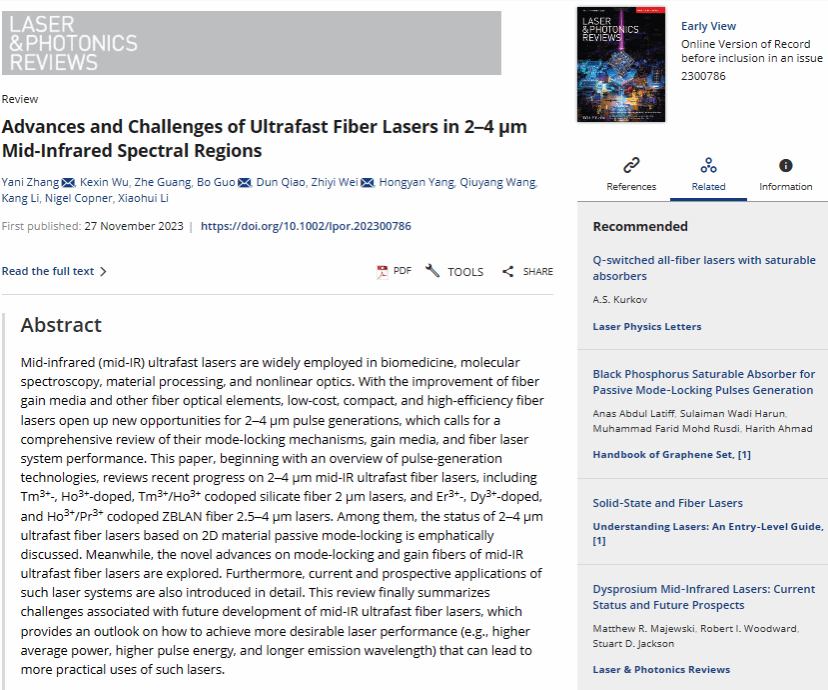 11月27日,德赢官网物理与信息科学学院物理学科张亚妮教授联合美国佐治亚理工大学广哲博士、英国卡迪夫大学乔敦博士撰写的题目为 “Advances and Challenges of Ultrafast Fiber Lasers in 2~4 µm Mid-Infrared Spectral Regions” 的论文在国际高水平期刊《Laser Photonics Reviews》发表。张亚妮教授为论文第一作者和通讯作者,德赢官网物理学2023届硕士武柯欣为共同第一作者,德赢官网Vwin为唯一通讯单位,哈尔滨工程大学郭波教授和中国科学院物理研究所魏志义研究员为共同通讯作者。
