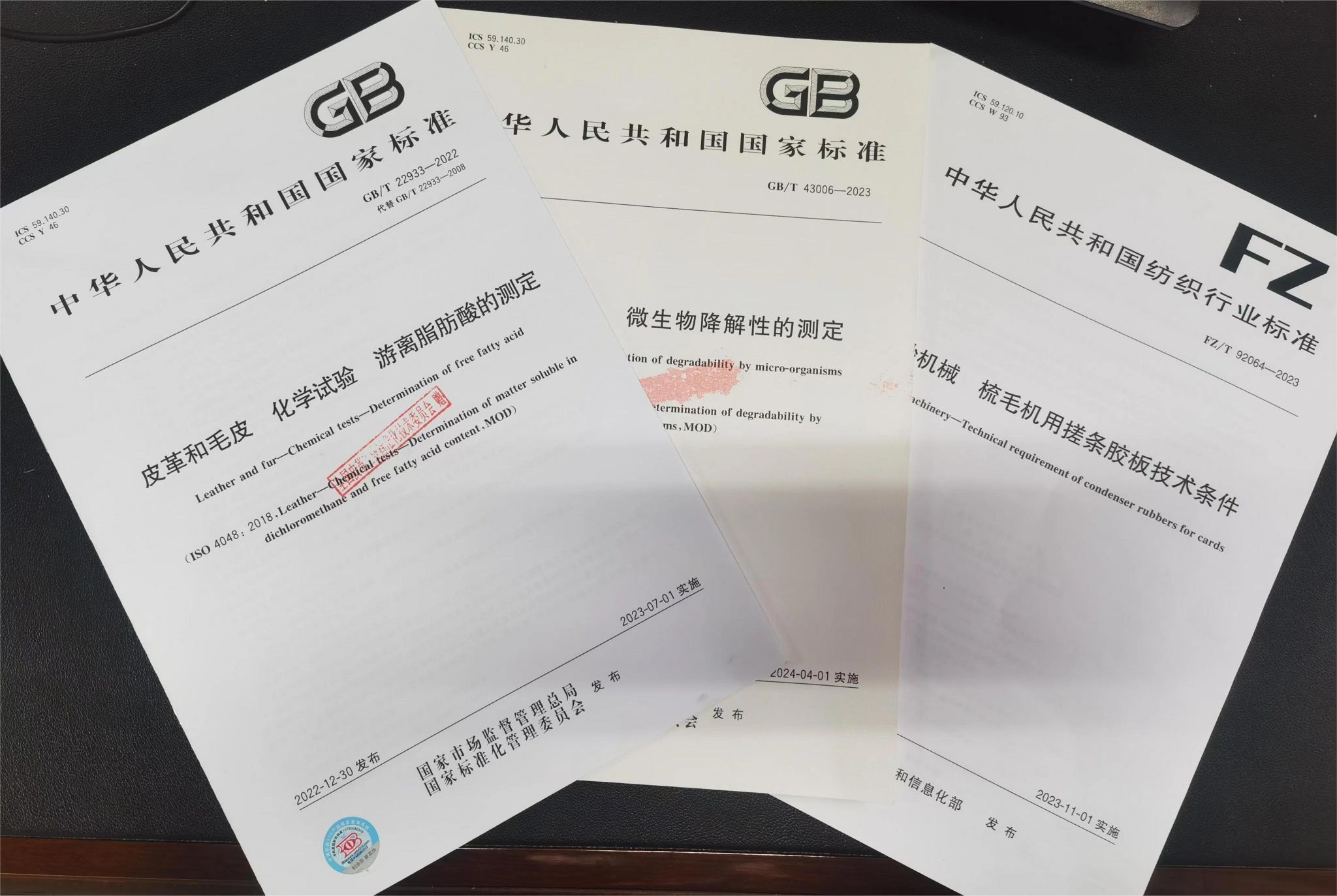 近日,德赢官网强涛涛教授承担的《皮革和毛皮化学试验游离脂肪酸的测定》(标准编号:GB/T22933-2022)、《皮革和毛皮微生物降解的测定(标准编号:GB/T43006-2023)》等两项国家标准和一项纺织行业标准《纺纱机械梳毛机用搓条胶胶板技术条件》(标准编号:FZ/T92064-2023)正式发布。