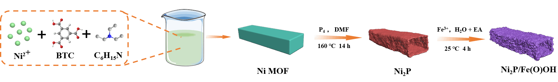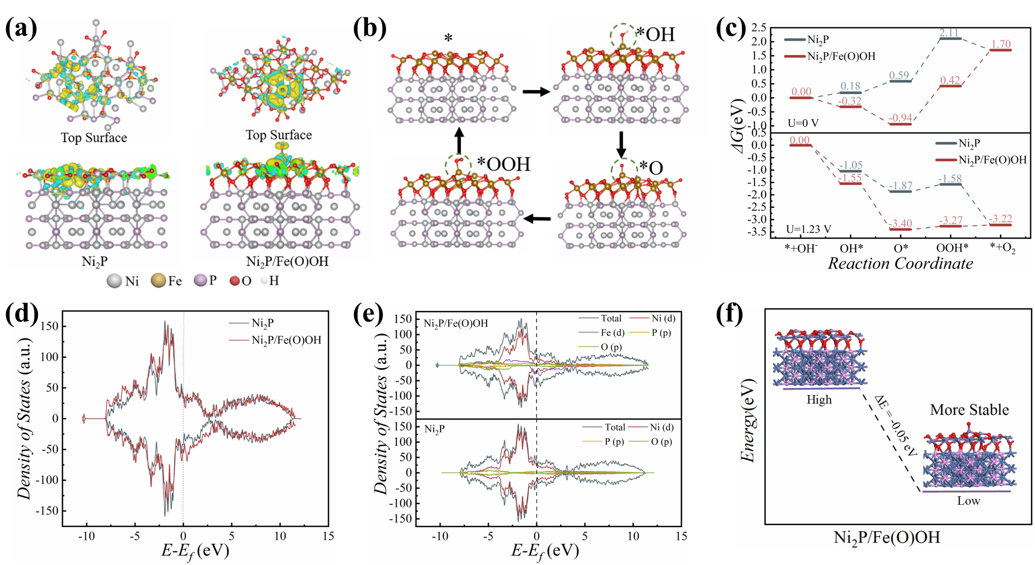 随着人们对化石燃料过度消费导致环境问题的日益关注,氢作为能源载体成为最有希望的替代能源。水电解制氢被认为是大规模获得高纯氢气最适用的技术。然而,阳极析氧反应(OER)是一个复杂且动力学缓慢的四电子转移过程,长期以来一直是水电解的主要瓶颈。富金属磷化镍相具有高导电性和丰富的电催化位点,可在碱性溶液中有效催化OER。然而,如何有效地增加电催化活性位点的数量,降低羟基(ΔGOH*)在Ni位点的吸附能,进一步提高电催化OER活性仍是一个挑战。Fe(O)OH环保且成本低,但其电催化OER活性较差,受限于Fe位点上的低电导率和羟基吸附较弱。然而,Fe位点上的弱吸附使得调节相邻Ni位点上氧合物质的吸附能成为理想选择,形成异质结构可以增强表面亲水性,改变表面活性位点的电子结构和化学环境,改变界面双层结构,中断界面水偶极子排列。这些因素可导致OER催化活性增强。因此,Ni2P/Fe(O)OH异质结构有望实现高效的电催化OER活性,对未来水电解制氢的广泛应用至关重要。