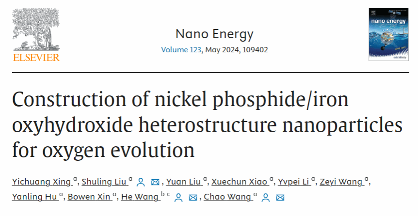 近日,德赢官网化学与化工学院刘淑玲教授团队在电解水制氢领域得重要进展,相关成果以“Construction of nickel phosphide/iron oxyhydroxide heterostructure nanoparticles for oxygen evolution”为题,发表在国际知名期刊Nano Energy(IF=17.6)上。德赢官网硕士研究生邢一创为第一作者,刘淑玲教授、王超副教授、中科院山西煤化所王鹤助理研究员为论文共同通讯作者,德赢官网Vwin为第一通讯单位。
