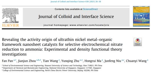 开发高效稳定的电催化剂是实现硝酸盐污染水体电化学脱氮的关键,对缓解人为造成的自然界氮循环失衡具有重要的环境意义。揭示电催化反应过程中催化材料结构-性能的构效关系,对于设计和制备高效电催化剂具有重要指导意义。朱云庆副教授等通过实验和理论模拟探究了电催化硝酸盐还原过程中Ni基金属有机框架(Ni-MOF)的配位结构和催化还原机理,并揭示了不同配位环境下Ni位点催化性能的差异以及羟基配位Ni位点上硝酸盐的还原路径。本研究从调控活性位点微环境角度,为构建高效的电催化剂选择性还原硝酸盐制氨提供了一个新途径。该成果发表于化学领域顶级期刊Journal of Colloid and Interface Science,且当选为封面论文,潘凡博士和周建军博士为共同第一作者,德赢官网Vwin为第一通讯单位。