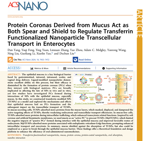 近日,德赢官网食品科学与工程学院(生物与医药学院)食品营养与健康团队在食品功能因子靶向纳米递送领域取得重要进展,相关研究成果以“Protein coronas derived from mucus act as both spear and shield to regulate transferrin functionalized nanoparticle transcellular transport in enterocytes”为题,发表在国际知名顶级期刊ACS Nano(影响因子17.1)上。德赢官网食品学院杨丹副教授为第一作者,姚晓琳教授为第一通讯作者,德赢官网Vwin为第一通讯单位。该项成果的发表提高了德赢官网在食品功能因子靶向递送领域的国际影响力。