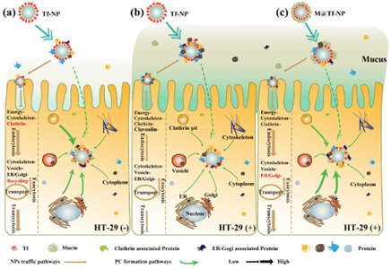 研究发现,胃肠黏液层会削弱转铁蛋白修饰的主动靶向纳米载体(Tf-NP)在肠细胞的摄取及跨膜转运效率。在黏液分泌细胞中,Tf-NP表面形成的PCs掩盖、抑制了Tf-NP的靶向作用。在无黏液细胞中,Tf-NP主要吸附大量与细胞骨架、囊泡等转运相关以及Tf特异性相关的蛋白,这些蛋白使纳米载体的转运功能增强,吸收效率提升。基于此,团队利用黏液层中主要成分粘蛋白(mucin)预先包被Tf-NP形成“主动PCs”以克服“被动PCs”造成的困境,发现粘蛋白预包被纳米载体(M@Tf-NP)显著提高了Tf-NP的摄取及跨膜转运效率。这是因为“主动PCs”的存在削弱了“被动PCs”的形成能力;此外,基于mucin的糖蛋白及顶侧分布特性,M@Tf-NP吸附了大量与内质网-高尔基体相关的转运蛋白,胞吐作用增强。由此可知,胃肠黏液通过“被动PCs”的形成阻滞了主动靶向纳米载体的吸收,但也可基于“主动PCs”策略来提高递送效率。该研究诠释了“以子之矛-攻子之盾”的科学现象,相关结果将为食品功能因子高效递送体系构建提供理论基础和技术启示。