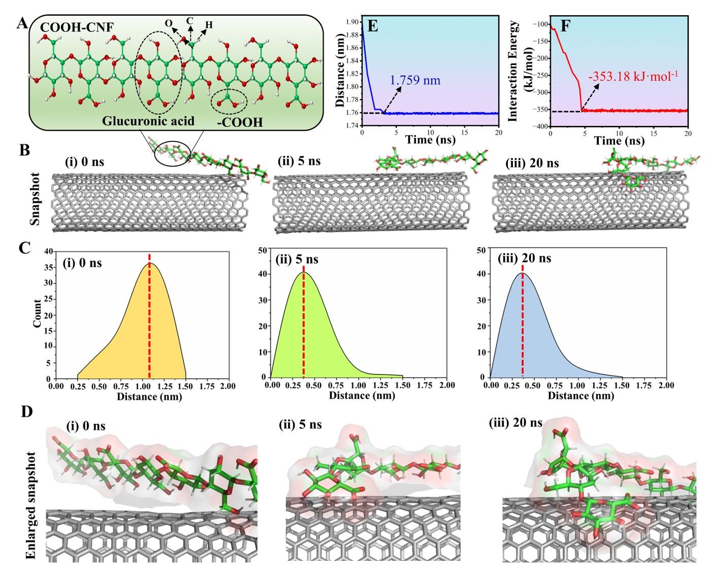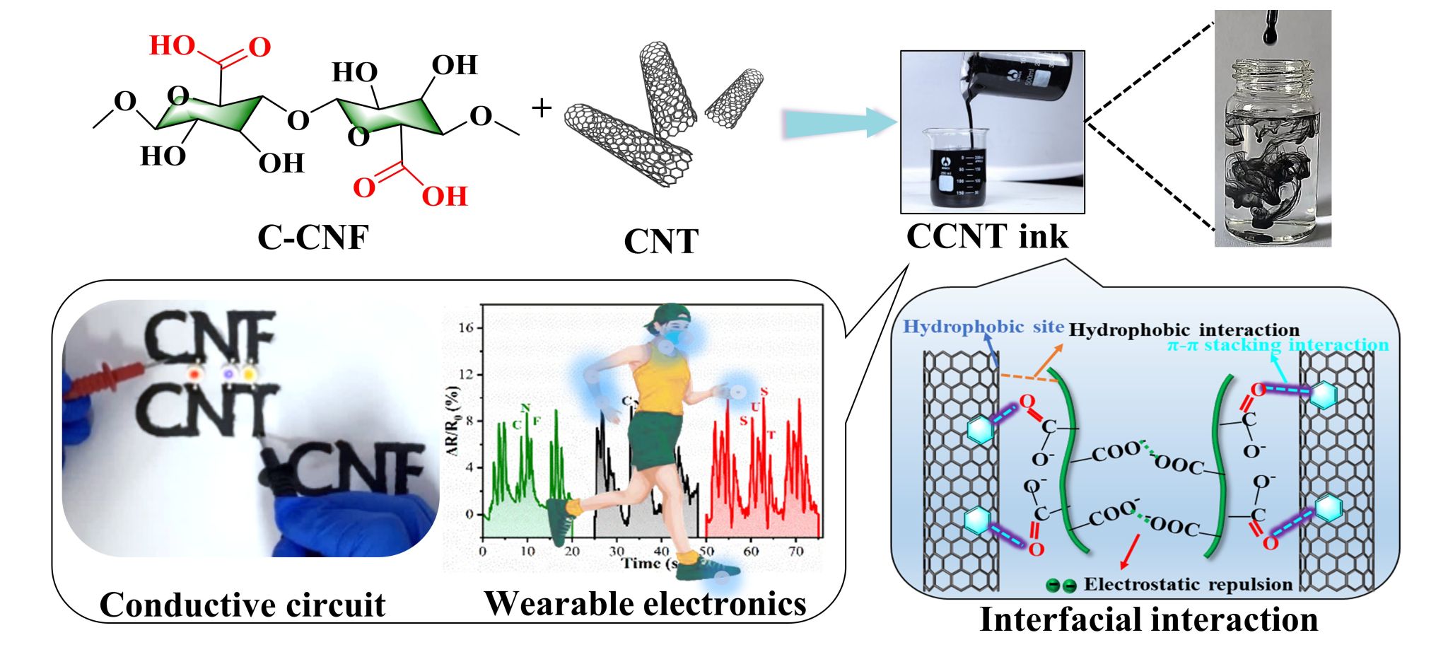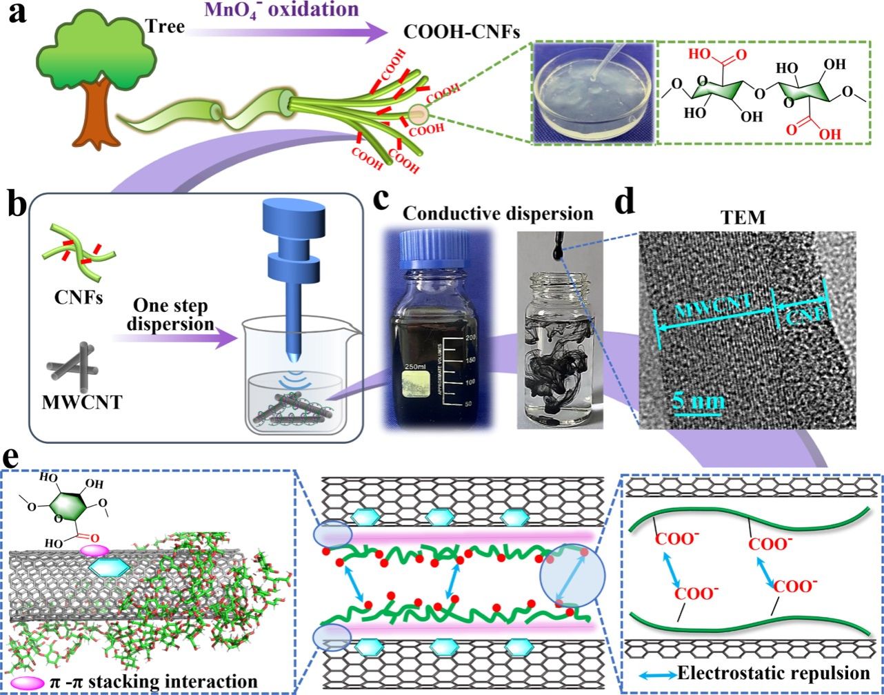 随着柔性可穿戴器件、智能健康监测和人机交互系统等的快速发展,纳米纤维素(CNF)与碳纳米管(CNT)复合形成的导电材料,成为柔性电子设备开发的重要基础性材料。然而,CNT结构中较强的范德华力导致其极易发生团聚或缠绕,阻碍了其在柔性电子传感领域的发展。纳米纤维素因具有一维纳米尺寸和表面活性基团的可调控性,被认为是理想的CNT分散剂,本研究中,我们使用CNFs作为绿色分散剂将CNT均匀稳定地分散在水中,并研究了分散效果和机理。