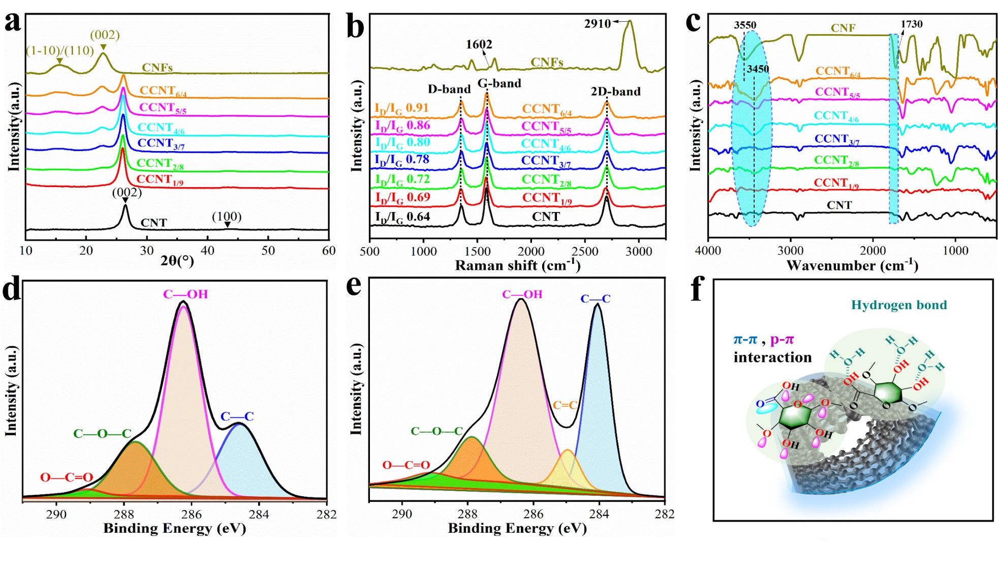 图1 CCNT分散体的制备与表征。(a) C-CNFs提取示意图;(b) CCNT分散体形成示意图;(c) 显示CCNT分散体在水中快速扩散的照片;(d) CCNT分散体的TEM图像;(e) 基于C-CNFs和CNT分子之间的π-π共轭效应和静电排斥协调的分散机制