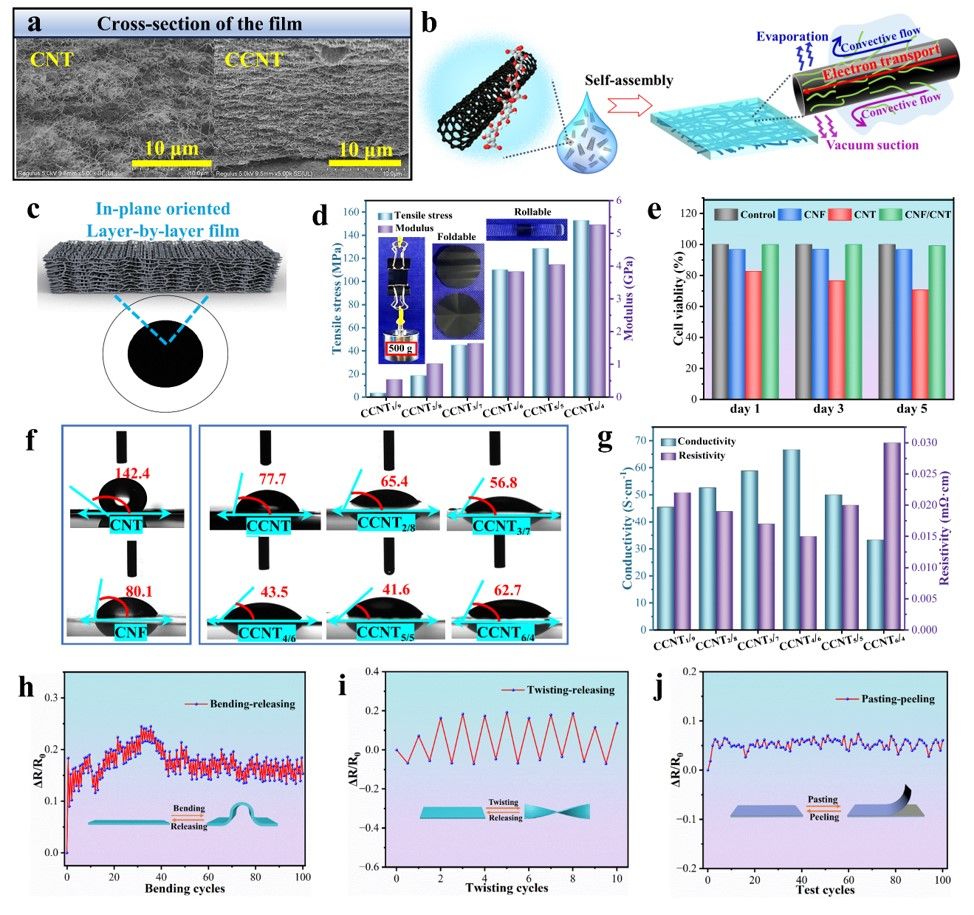 图2 CCNT薄膜的表征。(a)薄膜的横截面形态;(b)CCNT的蒸发和真空过滤驱动自组装示意图;(c)具有平面内取向的CCNT自组装薄膜示意图;(d)不同CCNT复合薄膜的力学性能分析;(e)不同组别在不同培养日的细胞存活率;(f)CNT、CNF和CCNT薄膜的水接触角;(g)不同CCNT薄膜的导电率和电阻率;(h-j)薄膜在经历500次弯曲、10次扭转和100次胶带剥离后的电阻变化