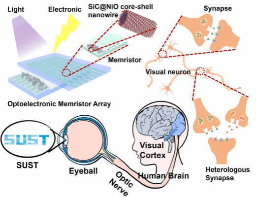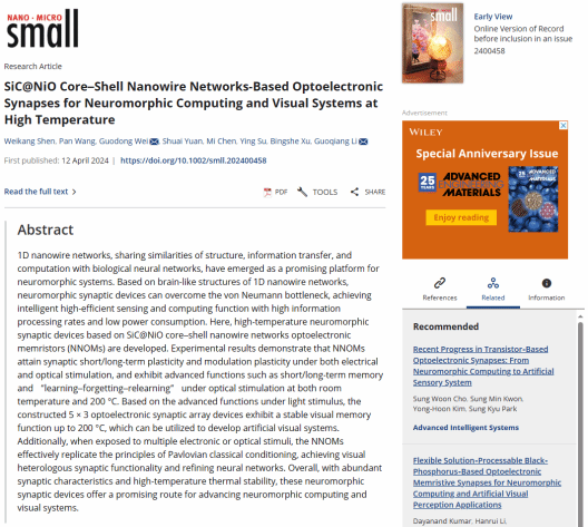 忆阻器是一种新型的电子元件,其作用类同于大脑中信息处理基本单元的神经突触功能,用其构建的芯片具有类脑学习和低功耗的特点,是未来神经形态器件和人工智能器件重要发展方向。近日,德赢官网物理与信息科学学院材料原子分子科学研究所许并社领导的认知材料团队尉国栋教授在著名国际学术期刊《Small》上发表题为“SiC@NiO Core-Shell Nanowire Networks-Based Optoelectronic Synapses for Neuromorphic Computing and Visual Systems at High Tempersture”的高水平论文。德赢官网硕士研究生申伟康为第一作者,物理学院王盼老师为共同第一作者,尉国栋教授和李国强教授为共同通讯作者,德赢官网Vwin为第一通讯单位,华南理工大学为共同通讯单位,该论文的发表标志着德赢官网在基于第三代半导体碳化硅基光电突触器件在神经形态计算和人工视觉系统方面的突破。
