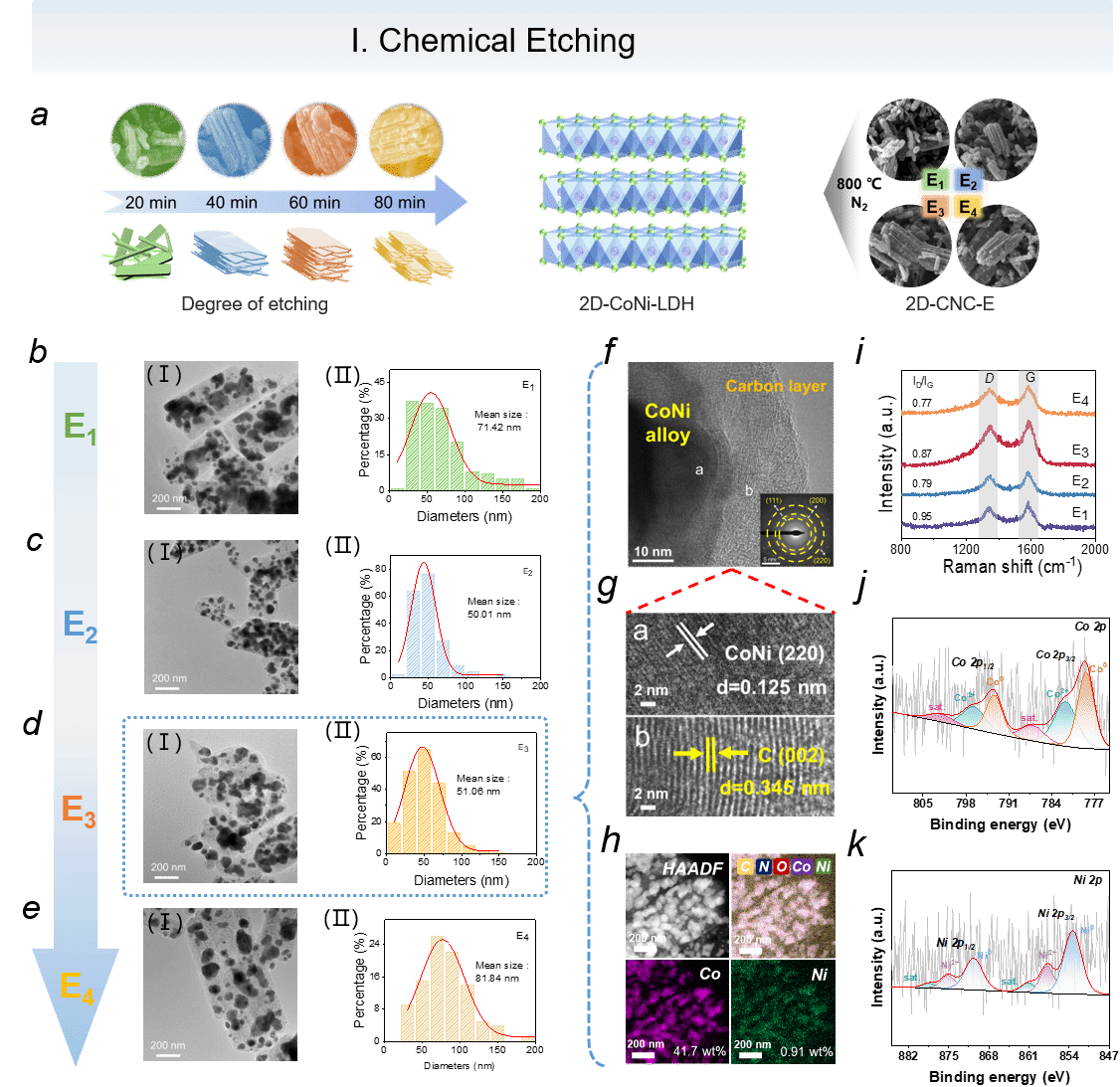 1.设计了“两步氧化还原”策略,利用咪唑酸钴硼骨架(Co-BIF)为前驱体,通过改变2D-CNC-Ex(x=1、2、3和4分别表示20、40、60和80 min)的化学氧化刻蚀时间,实现了阻抗特性的定制调控。进一步,调节2D-CNC-Tx的(x=1、2和3分别表示600、800和1000℃)煅烧还原温度,通过原位显微技术深入揭示材料内部随温度变化的二维复合材料的结构演变。
