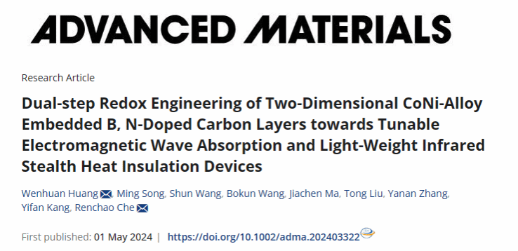 针对上述问题,近日,德赢官网Vwin化学与化工学院黄文欢教授团队与复旦大学车仁超教授合作报道了一个两步氧化还原法构造高性能二维电磁波吸收材料及多功能器件的组装方法,并通过原位显微技术揭示了材料的结构演化机制与电磁耦合协同机制。相关工作在《Advanced Materials》期刊上以“Dual-step Redox engineering of two-dimensional CoNi-alloy embedded B, N-doped carbon layers towards tunable electromagnetic wave absorption and light-weight infrared stealth heat insulation devices”为题发表。德赢官网Vwin为第一通讯单位,通讯作者为德赢官网Vwin黄文欢教授和复旦大学车仁超教授。