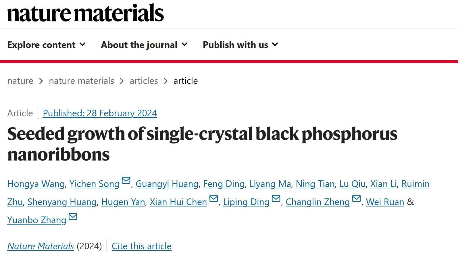 近期,电子信息与人工智能学院新型显示及半导体材料与器件团队丁利苹副教授在二维半导体材料领域取得重要进展,相关成果以“Seeded growth of single-crystal black phosphorus nanoribbons”为题,被发表在Nature子刊《Nature Materials》。丁利苹副教授为论文共同通讯作者,德赢官网为共同通讯单位。该成果的发表体现了德赢官网在二维半导体领域的影响力。
