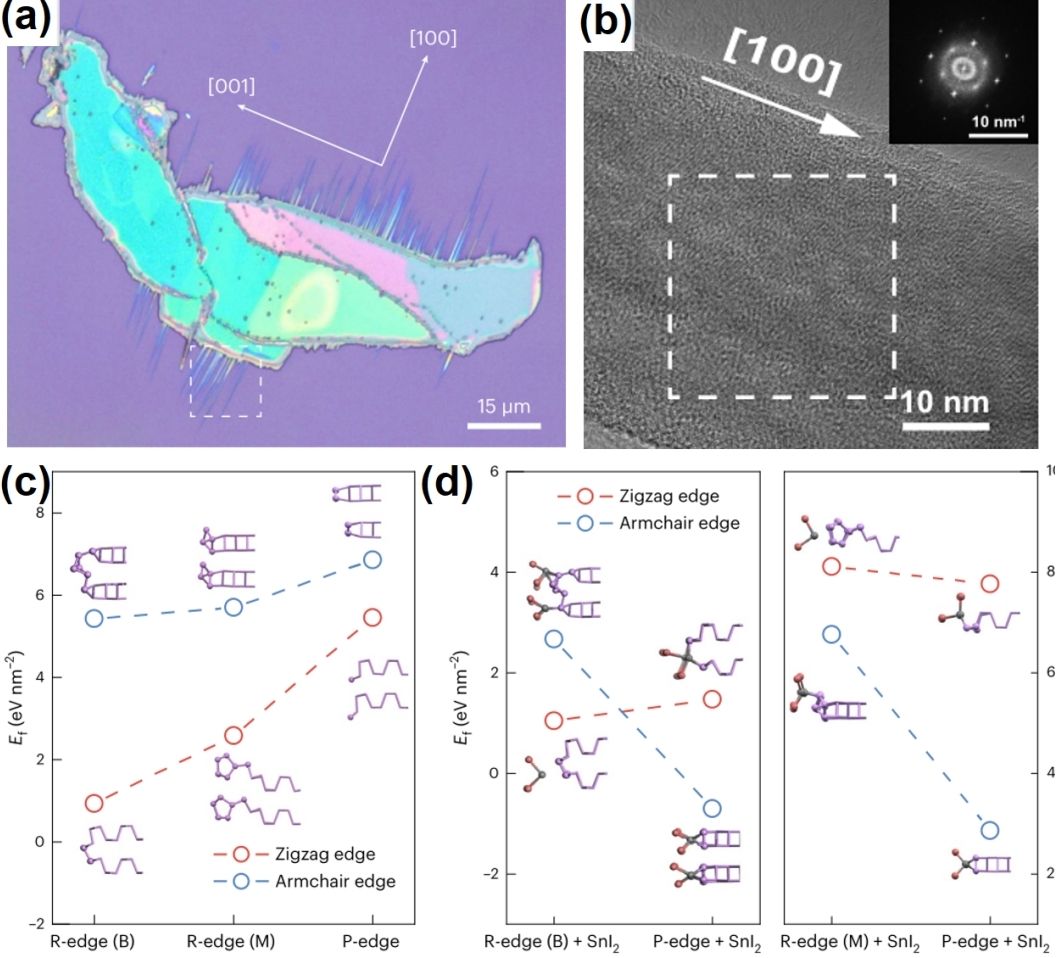 (a) 单晶黑磷纳米带光学图像及(b) TEM图;(c) 重构边界和原始边界的形成能;(d) 有矿化剂SnI2分子存在时的重构边界和原始边界的形成能