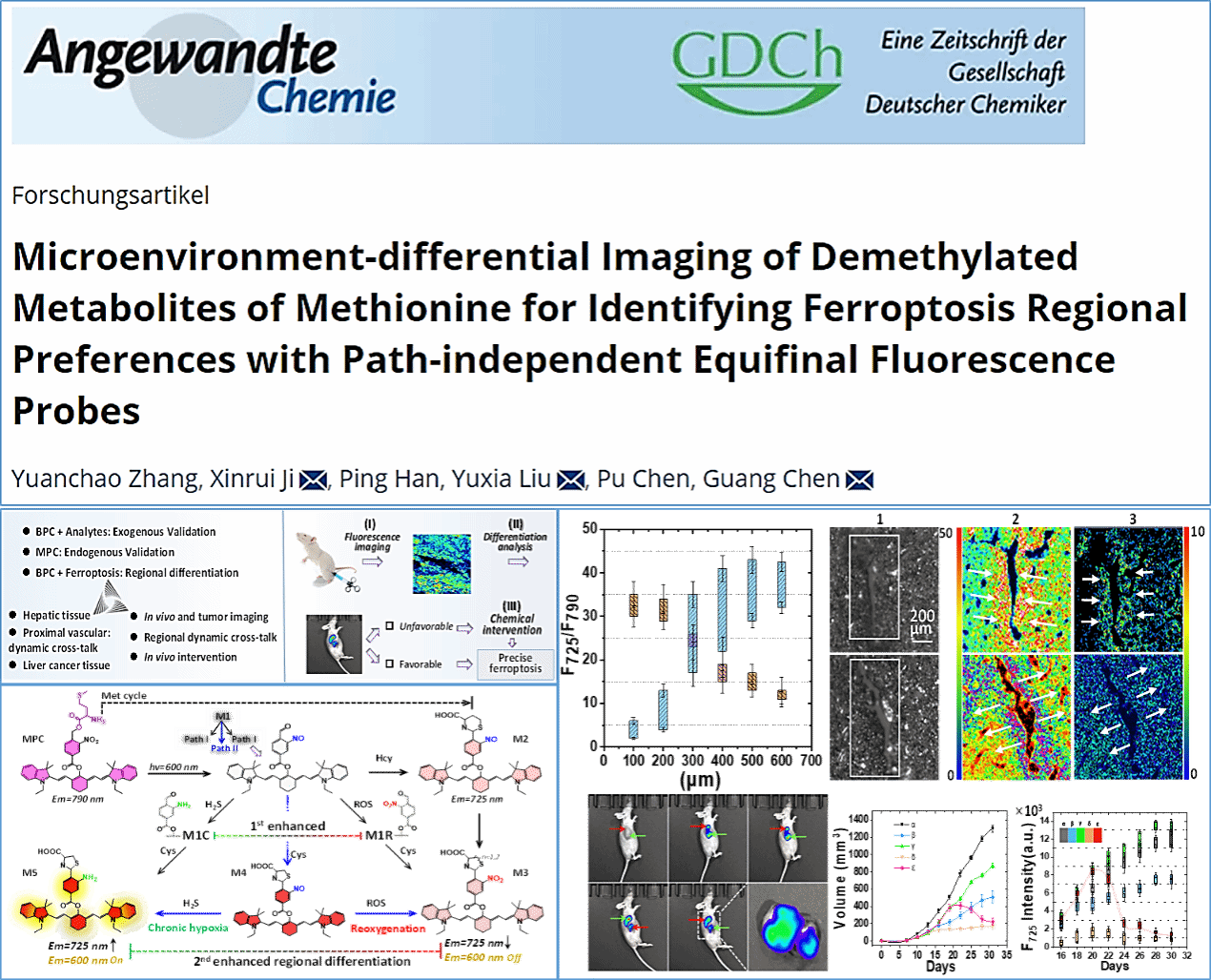 近日,德赢官网化学与化工学院陈光教授课题组在新型荧光分子开发方面取得重要进展,相关研究成果以“Microenvironment-differential Imaging of Demethylated Metabolites of Methionine for Identifying Ferroptosis Regional Preferences with Path-independent Equifinal Fluorescence Probes”为题发表在《Angew. Chem.》(自然指数期刊,综合性1区TOP期刊),德赢官网为第一通讯单位,化学与化工学院博士生张远超为第一作者,陈光教授为通讯作者,加拿大滑铁卢大学的Xinrui Ji研究员及德赢官网刘玉霞副教授为共同通讯作者。国家自然科学基金面上项目(22174090)提供经费支持。该研究的发表极大地推进了德赢官网在相关学科领域的影响力。