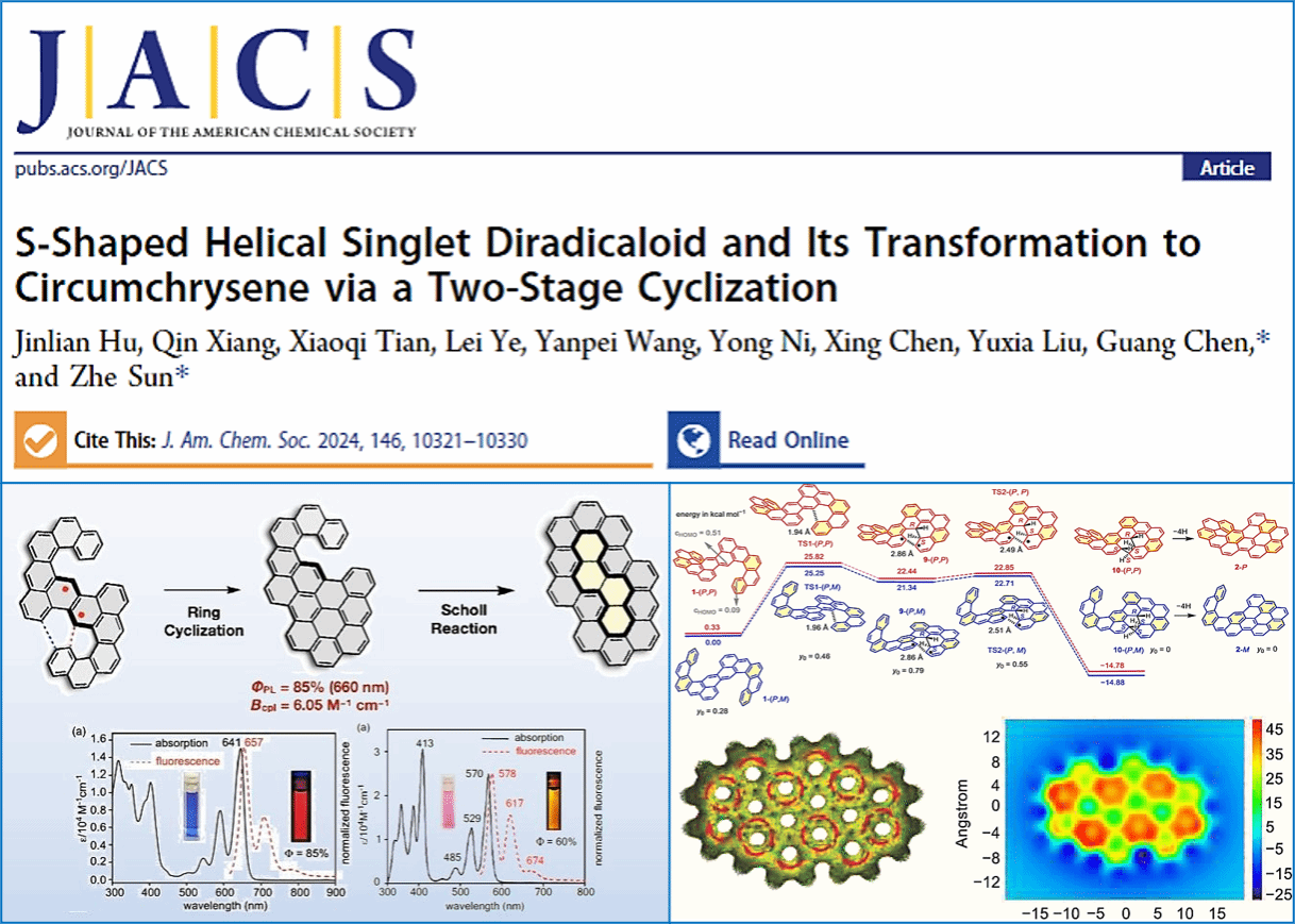 此外,为开发新型荧光分子,陈光教授课题组与天津大学孙哲教授课题组联合研究了利用单线态双自由基关环反应合成高量子产率大环荧光母体。相关研究成果以“S-Shaped Helical Singlet Diradicaloid and Its Transformation to Circumchrysene via a Two-Stage Cyclization”为题发表在《Journal of the American Chemical Society》(自然指数期刊,综合性1区TOP期刊),德赢官网为第二通讯单位,陈光教授为共同通讯作者。文中设计并合成了具有单线态双自由基基态的S形双重螺烯化合物。该化合物的双自由基性质,降低了热激发电环化反应的反应能垒,使得其可在螺烯位置快速高效地进行级联电环化反应构建两个C-C键,并在氧化剂存在的情况下实现脱氢得到共轭延展的螺烯化合物。最后作者利用Scholl反应实现了关环反应,得到了环屈化合物,其性质稳定、荧光量子产率高,对于后续开发高亮度荧光分子并用于肿瘤切除手术导航等领域具有重要参考价值。
