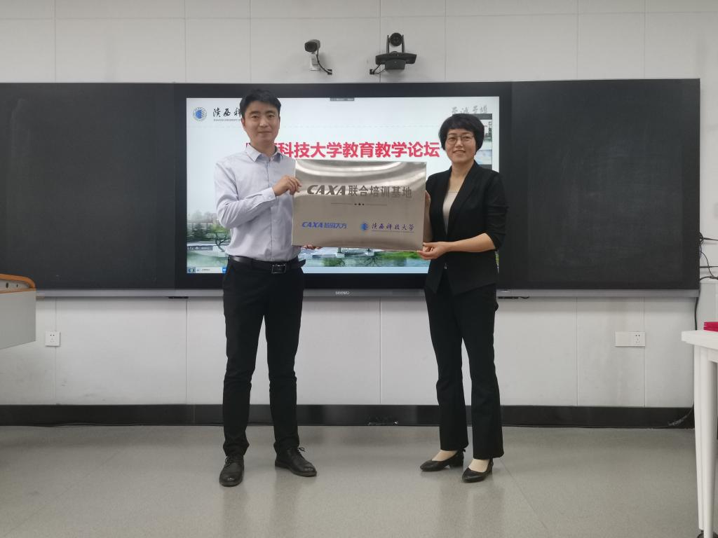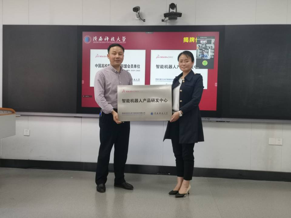 陈阳代表公司向机电学院捐赠SolidWorks正版软件授权点130个,SolidWorks国际认证考试免费名额10个。王艳代表CAXA向机电学院机器人工程专业捐赠CAXA3D教育版软件永久授权5个,用于教育培训和机器人研究开发。
