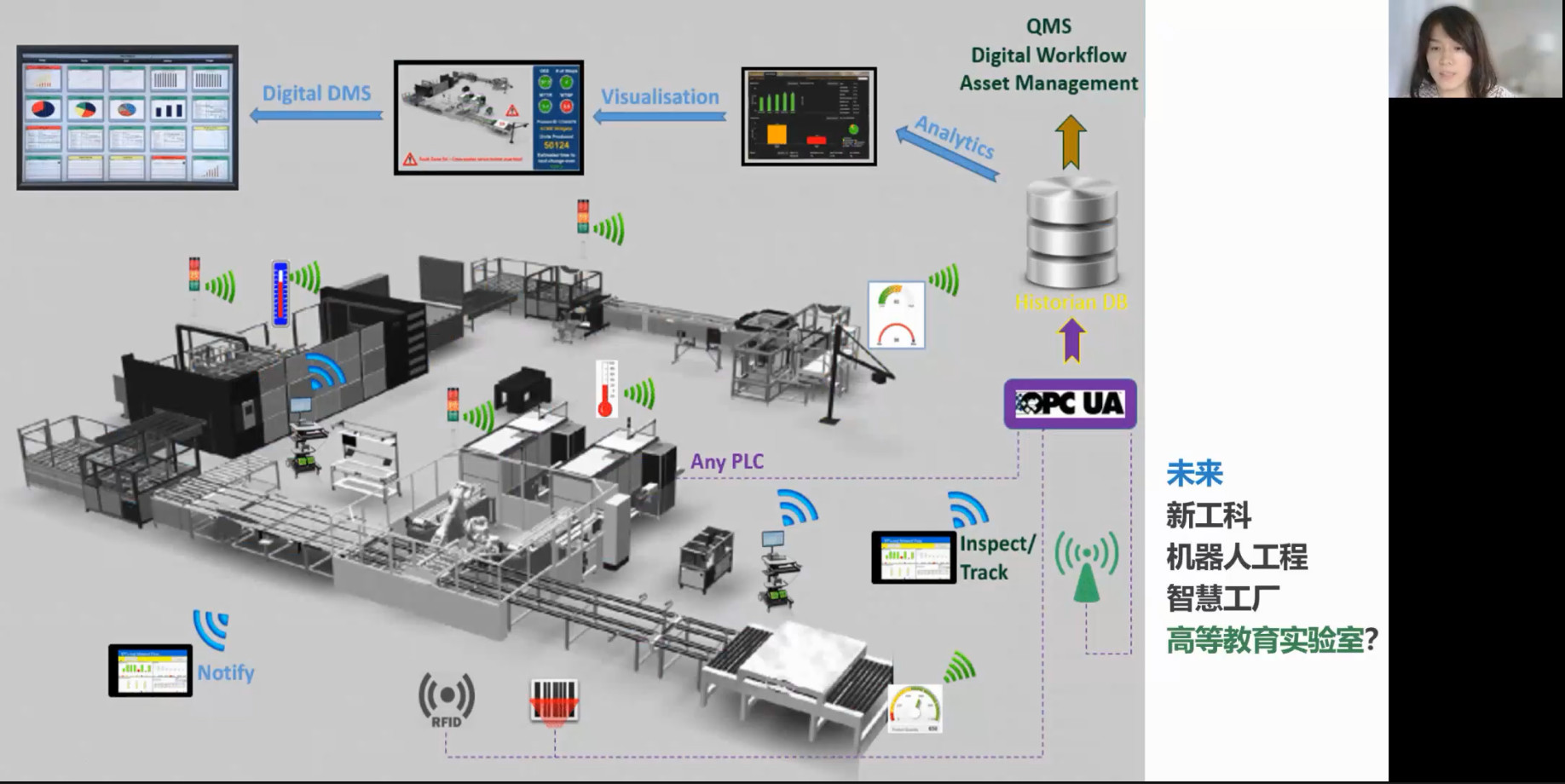 贾敏围绕数字孪生、智造创新和桌面智慧工厂等相关技术,针对工业4.0时代的未来智慧工厂形态进行了详细的介绍。她强调,未来智慧工厂将会是实体物理环境和虚拟网络世界的深度融合,也是一个“数字孪生”的人机交互系统,更将是新工科人才的主要聚集地。