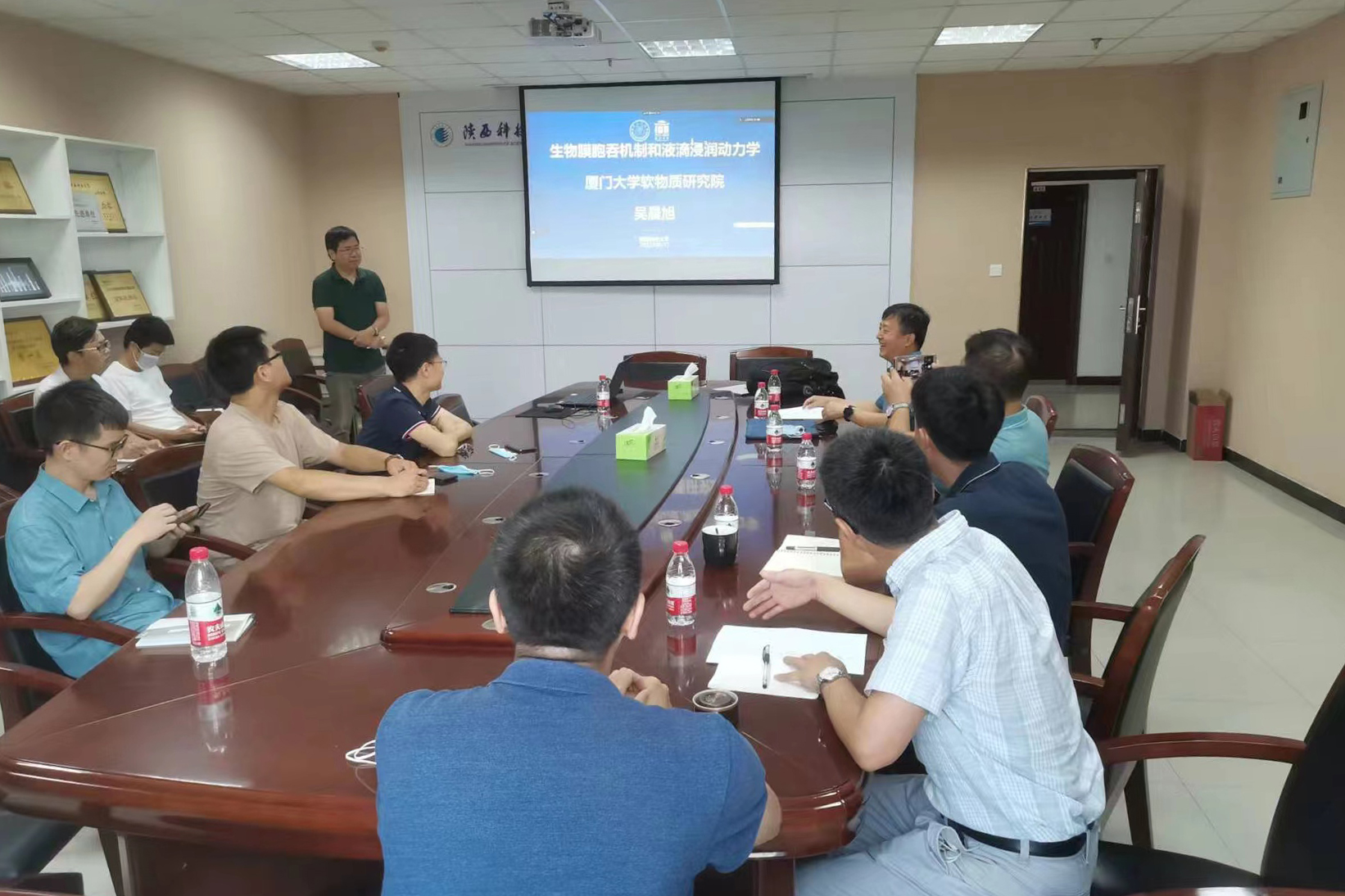 8月17日上午,应文理学院邀请,厦门大学吴晨旭教授做客德赢官网“前沿科学报告”,报告题目为“生物膜活性颗粒吞噬机制和液滴浸润动力学”,报告会线下和线上同时进行。报告会由文理学院院长刘建科主持,物理学科教授、研究生导师、国家自然科学基金申报教师及部分研究生等50余人参加了此次报告会。