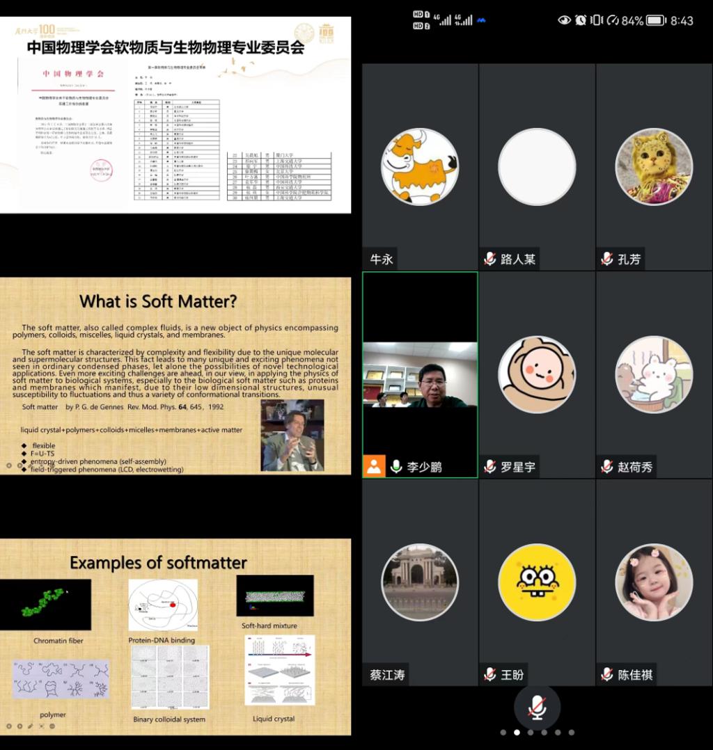 吴晨旭教授首先深入浅出的讲述了用Onsager变分原理研究电场驱动下液滴的非平衡态演化过程、外力驱动下活性颗粒被生物膜吞噬机制。最后,吴晨旭教授并分享了在外力诱发下的包裹角相变、活性颗粒在外力驱动下的动力学相图等方面取得的最新研究进展与成果。吴教授的报告内容丰富,讲解生动,逻辑清晰,使聆听此次报告的师生对软物质、液滴浸润动力学等领域研究有更深的理解,拓宽了德赢官网物理学科的科研视野。