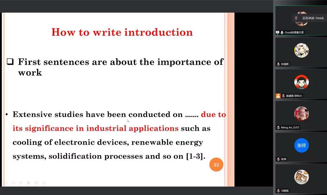 OmidMahian教授“从编辑和审稿人角度分析研究论文撰写”的报告赢得了线上师生的掌声。从查阅文献、论文不同部分撰写技巧,系统地讲述了科学论文撰写和如何合理地选择期刊进行投递。报告结束后,老师和同学们踊跃提问,大家结合自己在论文撰写过程中遇到的难题向OmidMahian教授提出许多学科问题,Omid Mahian教授也热情地和老师、同学进行了讨论,大家受益匪浅。
