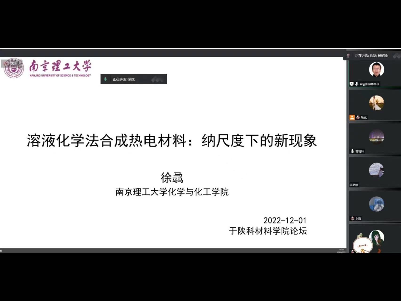应德赢官网材料科学与工程学院、科技处及前沿院邀请,西安交通大学肖钰研究员、南京理工大学徐骉教授分别于11月28日、12月1日做客德赢官网“前沿科学报告”,分别为德赢官网师生带来主题为“近室温铅硫族热电材料”“溶液化学法合成热电材料:纳尺度下的新现象”的线上学术报告,报告会由材料学院副院长王卓教授主持,材料学院相关专业教师及研究生参加了报告会。