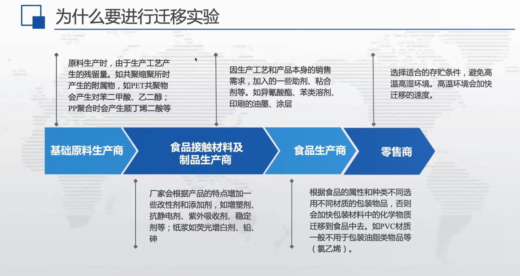 王思宇从实例出发,阐述了包装材料的渗透与迁移机理,通过该机理分析现行国标中对食品材料如何进行安全性评价,以及目前对于食品包装材料检测标准及其发展趋势。随后他介绍了化学品在包装中的物质迁移实验和我国目前在食品接触材料与法规方面的研究进展。