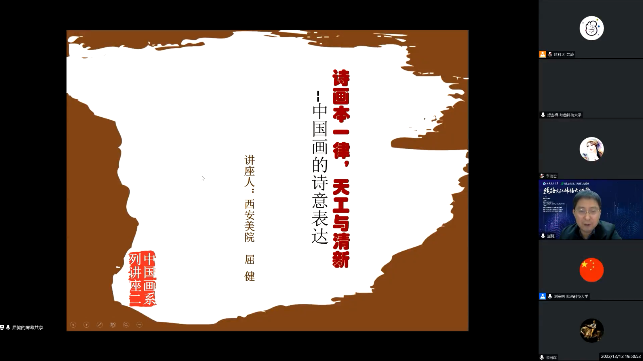 屈健教授从中国画与诗词关系的历史脉络切入,深度解读大量包含诗书画印传统的文人画作品和题画诗词,多角度探讨东西方不同语境背景下诗画间文化关系。屈教授通过详细阐述中国文化系统中这两种典型艺术形式,揭示出其具有的相互渗透与包容的特点,点明了中国画之所以成为独具特色国粹艺术的本质原因,探讨了中国画为公众艺术审美品位提升所创造的广阔空间。