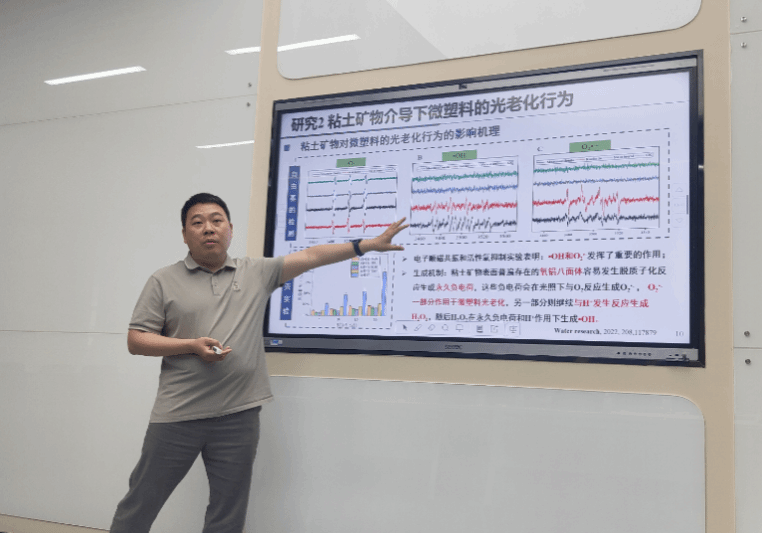 郭学涛教授介绍到土壤环境中微塑料的光老化机制尚不明确,并结合自己的研究介绍了微塑料在不同类型土壤中光老化的一系列成果,包括:通过对比光降解过程中微塑料的质量损失、表面形貌和微观结构的变化发现光照可以诱导微塑料在土壤中发生老化,有机质、粘土矿物和铁(氢)氧化物是促进微塑料在土壤中光老化过程的主要因素;在研究土壤矿物(粘土矿物和铁(氢)氧化物)对微塑料老化的影响中发现自由基(•OH)在土壤矿物介导下微塑料的光降解过程中发挥了重要的作用;之后对陆源溶解性有机物的理化特性、分子组成和光化学性能进行考察,发现陆源溶解性有机物的内在属性(类型、分子量)在微塑料老化中扮演着重要角色,明确了自由基生成、电子转移与陆源溶解性有机物的内在属性之间的联系。